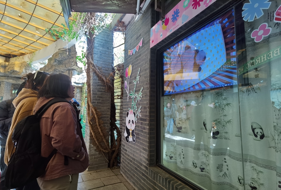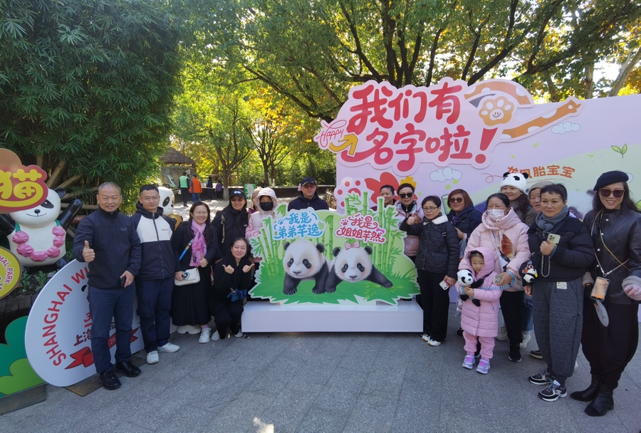市民游客在上海野生动物园大熊猫展区外合影。 陈玺撼摄