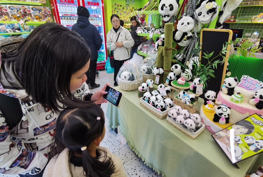 市民游客打卡大熊猫龙凤胎文创。 陈玺撼摄