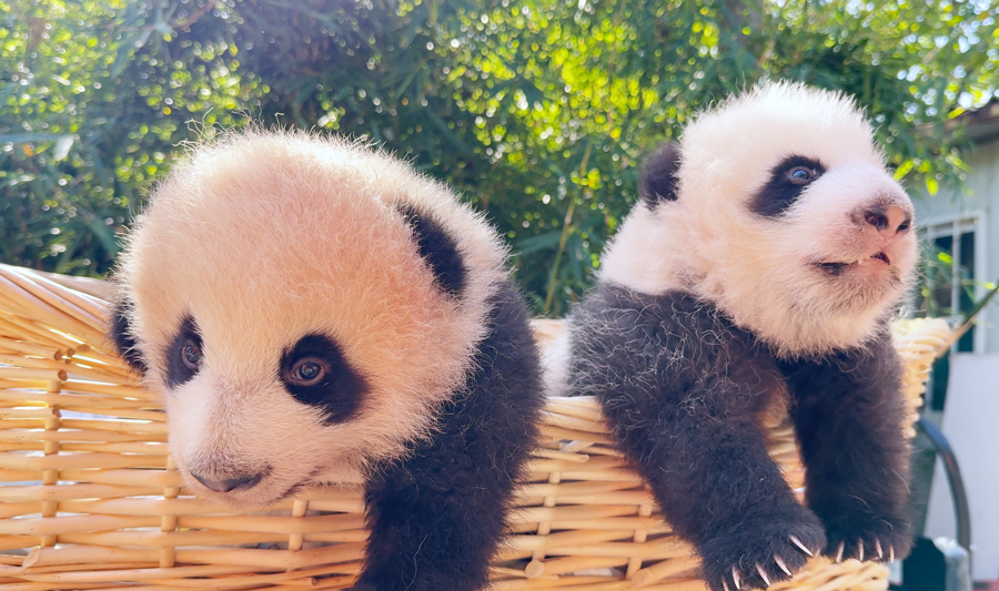 满月的大熊猫龙凤胎。 图片来源:上海野生动物园